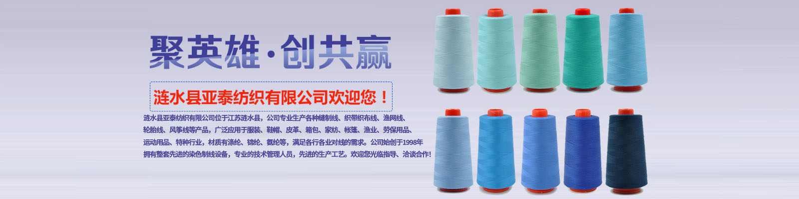漣水縣亞泰紡織有限公司位于江蘇漣水縣,公司專業(yè)生產(chǎn)各種縫制線、織帶織布線、漁網(wǎng)線、輪胎線、風(fēng)箏線等產(chǎn)品,廣泛應(yīng)用于服裝、鞋帽、皮革、箱包、家紡、帳篷、漁業(yè)、勞保用品、運(yùn)動(dòng)用品、特種行業(yè),材質(zhì)有滌綸、錦綸、氨綸等,滿足各行各業(yè)對(duì)線的需求。公司始創(chuàng)于1998年,擁有整套先進(jìn)的染色制線設(shè)備,專業(yè)的技術(shù)管理人員,先進(jìn)的生產(chǎn)工藝。歡迎您光臨指導(dǎo)、洽談合作!